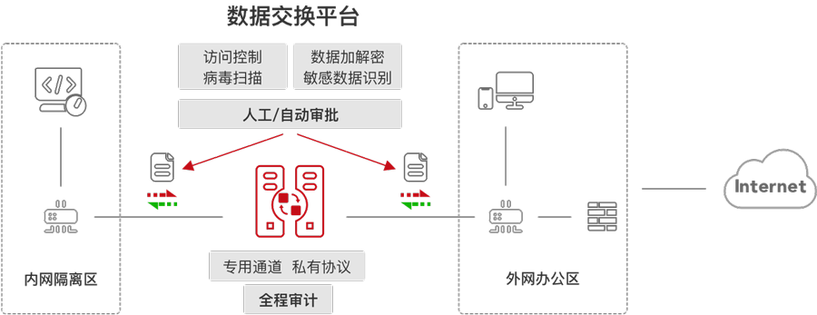 億賽通(tōng)數(shù)據安全交換系統(簡稱:DSES),部署在不(bù)同的(de)隔離(lí)網絡環境之間(jiān),為(wèi)客戶提供∞數(shù)據交換的(de)一(yī)體(tǐ)化(huà)解決方案。産品集成安全隔離(lí)、訪問(wèn)控制(zhì)、數(shù)據風(fēng)險識别、交換過程審♦批、日(rì)志(zhì)審計(jì)等多(duō)功能(néng)于一(yī)體(tǐ),大(dà)幅提升隔離(lí)網絡間(jiān)的(de)交換效率,實現(xi↔àn)高(gāo)速、安全、可(kě)靠的(de)信息交換服務。