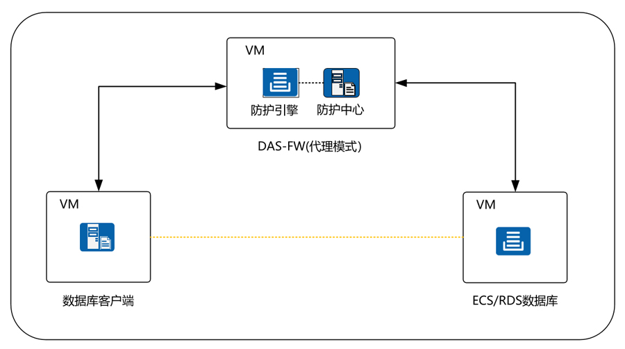在雲虛拟化(huà)場(chǎng)景下(xià),采用(yòng)虛拟化(huà)鏡像方式将數(shù)據庫防火(huǒ)牆部署于獨立虛拟機(jī)中,整體(tǐ)提供數(sh"ù)據庫防火(huǒ)牆功能(néng),如(rú)下(xià)圖所示: